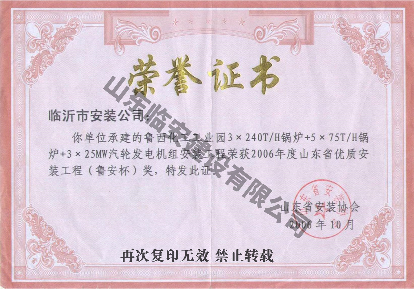 山東臨安建設(shè)有限公司(原名臨沂市安裝公司)始建于一九六六年,是由老國(guó)企改制的股份制企業(yè),公司總部位于羅莊區(qū)通達(dá)路211號(hào),現(xiàn)有職工1000余名,各類(lèi)工程經(jīng)濟(jì)技術(shù)人員816名,其中高中級(jí)職稱(chēng)64名,初級(jí)職稱(chēng)204人。主要從事機(jī)電工程施工總承包,電力施工總承包,石油化工施工總承包,建筑裝飾裝修施工總承包,鍋爐安裝、改造I級(jí)(參數(shù)不限),GB1、GB2(2)級(jí)、GC1級(jí)、GD1級(jí)壓力管道安裝,起重機(jī)械B級(jí)安裝,電力設(shè)施承裝、承試,并取得了GB/T19001-2008質(zhì)量管理體系認(rèn)證證書(shū)、GB/T28001-2011職業(yè)健康安全管理體系認(rèn)證證書(shū)、GB/T24001-2004環(huán)境管理體系認(rèn)證證書(shū),資信等級(jí)“AAA”級(jí)。